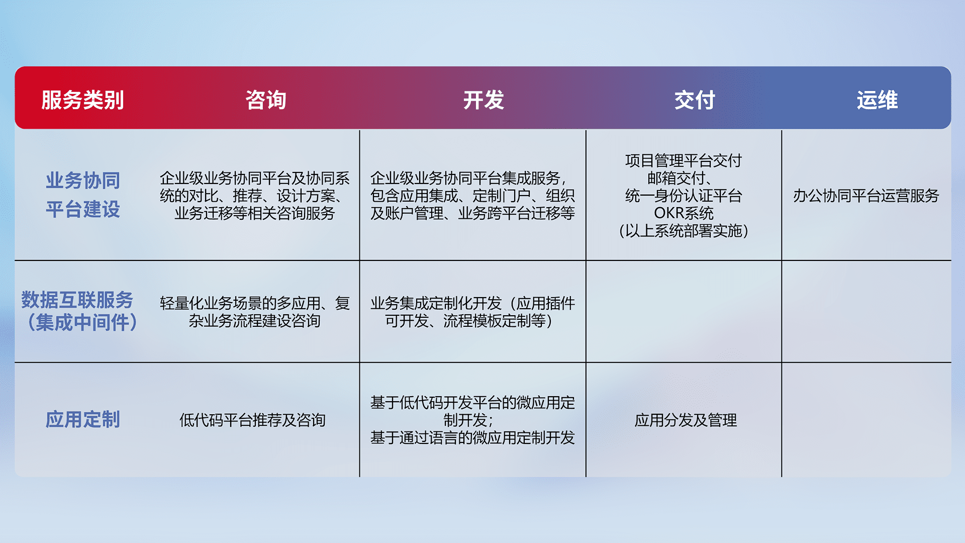 针对钉钉、、、、企微、、、、IDaas等平台级产品提供产品的规划、、方案、、、交付、、、、定制化开发等服务,,,,实现如统一协同办公、、、、智能客户服务、、、混合会议管理、、、智能数据查询、、、、等业务场景,,实现数字化转型。。