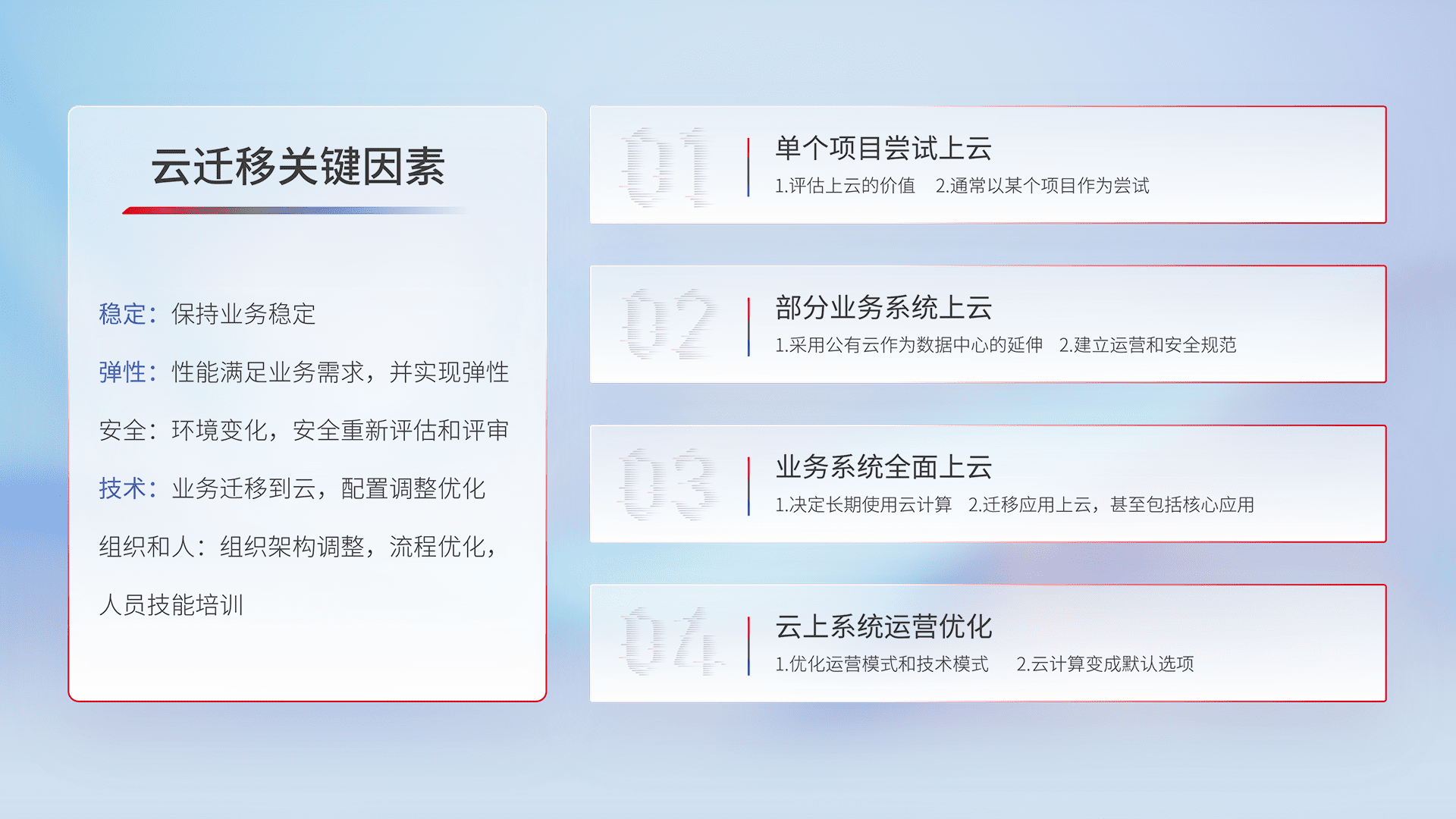 结合实际业务,,,,从规划设计、、、云平台选型、、、、云原生改造、、数据迁移、、、、集成交付,,,迁移全过程为客户识别最佳上云路径,,做好风险识别管理,,设计网络架构、、身份权限、、、、安全审计合规、、、、操作审计、、日志审计、、监控告警策略、、多站点容灾设计等,,,对云上基础设施进行整体规划,,,,提升IT治理水平,,,,以满足弹性、、、、高可用、、、高性能的需求。。。